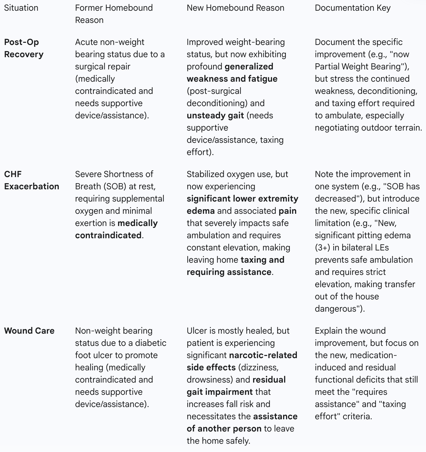 When a clinical parameter improves or another limitation emerges, you must document the change and clearly articulate the new reason that supports the continued homebound status. This is a critical point for demonstrating consistency: the underlying status is the same, but the clinical justification may have shifted.