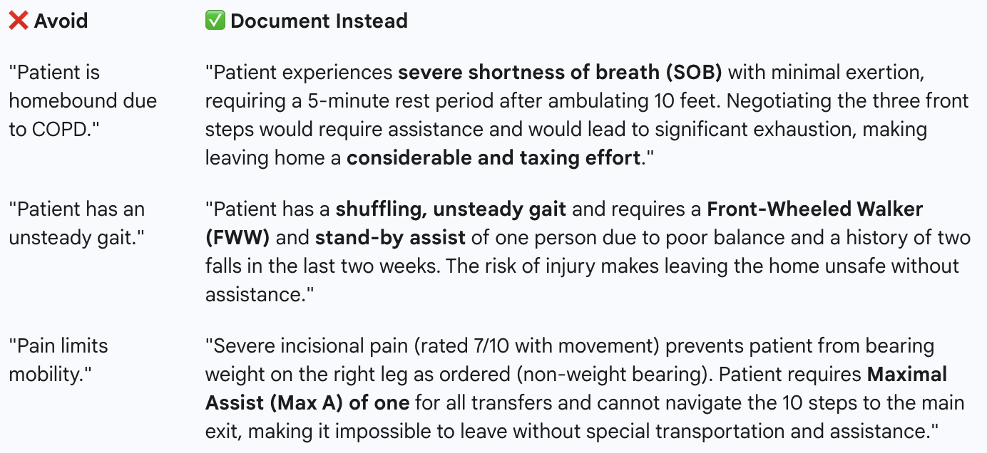 Avoid generic statements like "patient is weak" or "patient has SOB." Instead, paint a vivid, objective picture of the functional limitations and the effort involved in leaving the home.